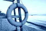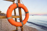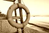 Lifebuoy hangs prominently on wooden stand near tranquil beach at sunset, overlooking calm sea and distant island