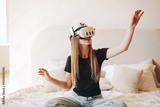 Young woman engages with virtual reality in a cozy bedroom setting while wearing a headset and exploring interactive experiences