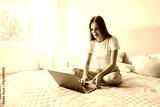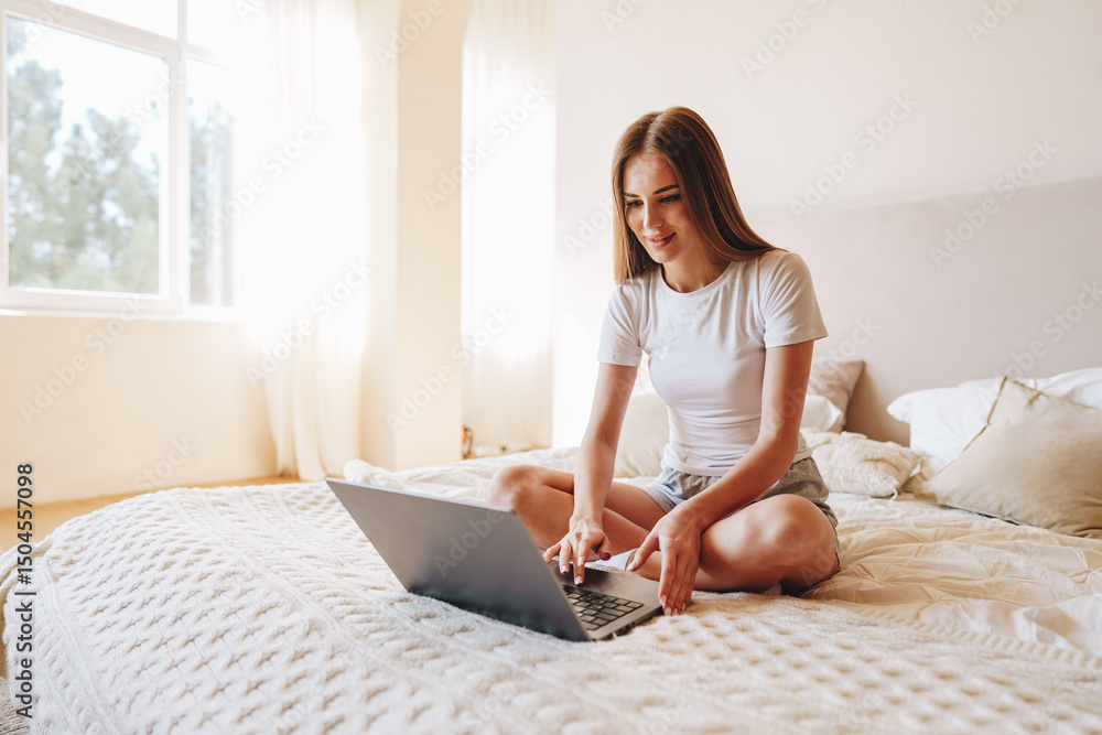 Young woman using laptop while sitting on bed in bright room during daytime