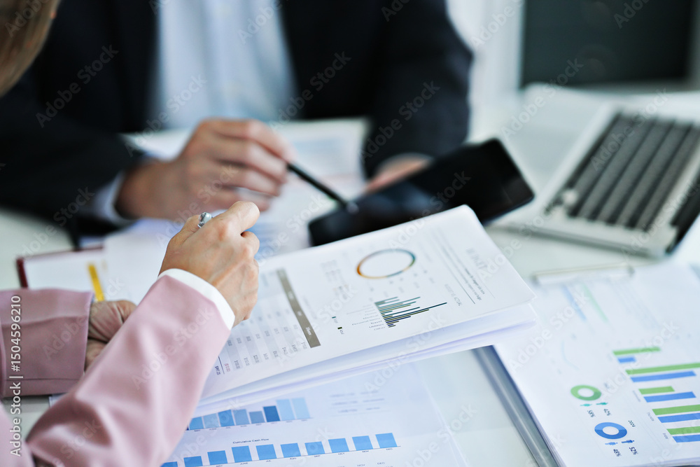 Business administrator evaluating marketing and sales data for improved business growth and financial results at office