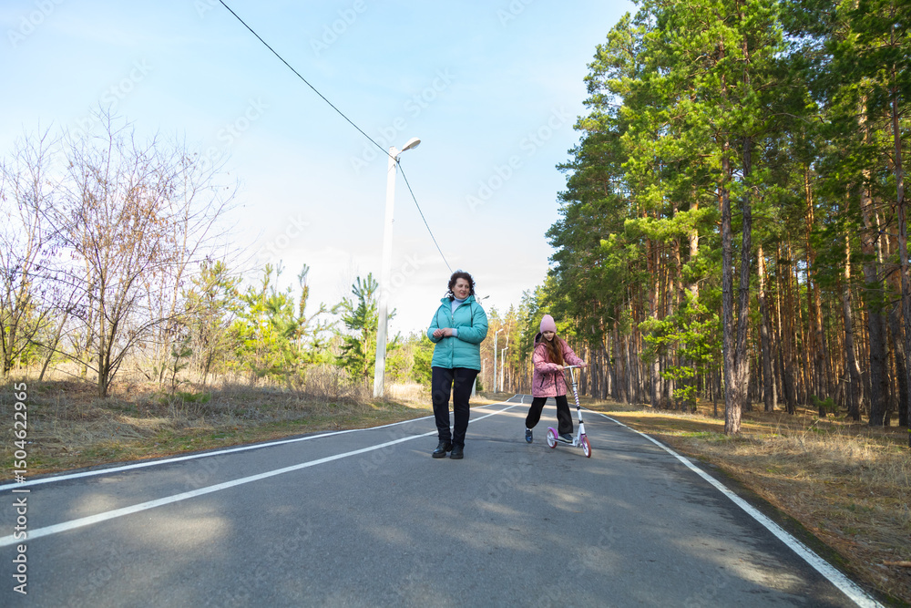 Little girl riding scooter while walking with her grandmother in the forest on a sunny day