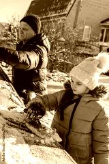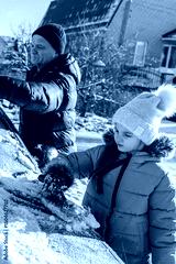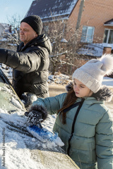 Grandfather with granddaughter removes snow from a car during a winter snowfall with a brush. Ice scraping. Winter car cleaning.