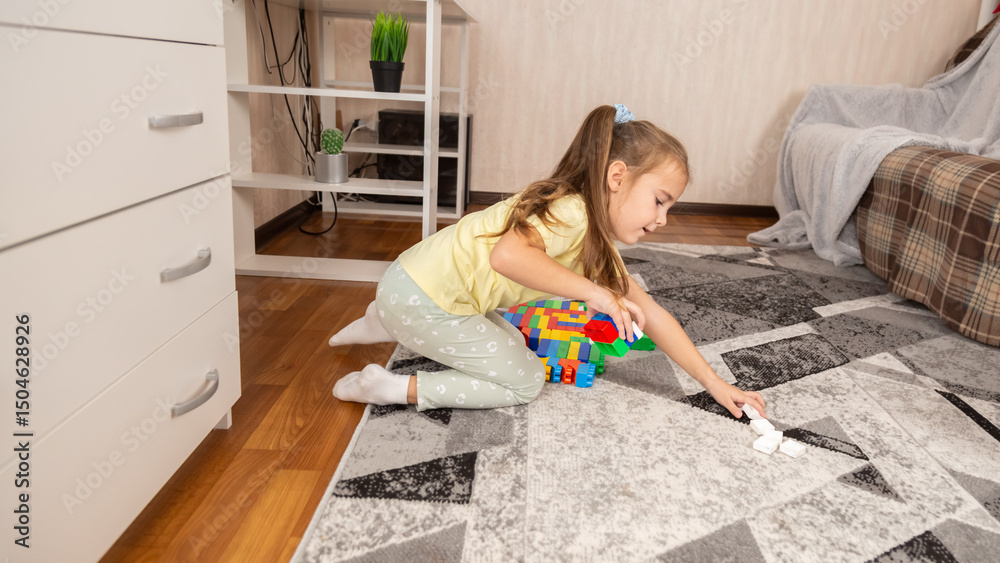 Little girl plays with small constructor toy on floor in home