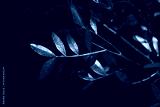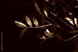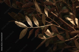 Smoke Close-up Selective soft focus gold, bronze green leaf twig on black. Natural abstract light, shadow background.
