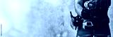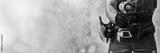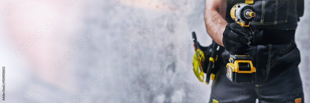 Uniformed construction worker holding a yellow colored cordless screwdriver with a set of tools on his belt. The concept of repair, maintenance and electrical installation.