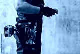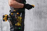 Electrician professional work uniform with a set of tools on his belt. Construction and electrical tools with drill, pliers and other hand tools.