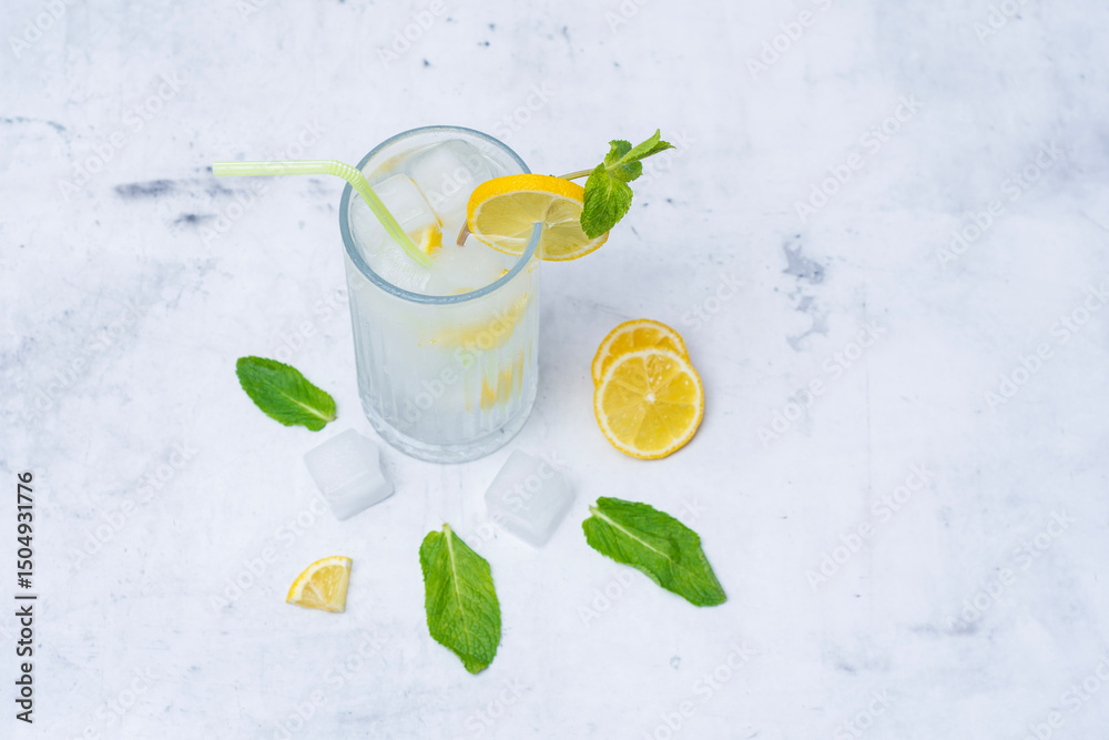 A glass of refreshing lemon water with ice cubes, mint leaves and a straw stands on a light marble background. A citrus drink for a healthy lifestyle, diet and freshness.