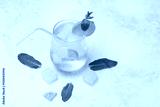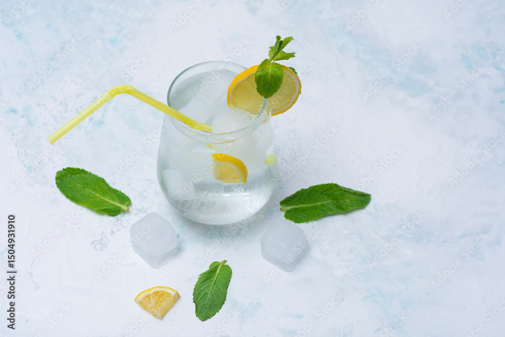 A glass of refreshing lemon water with ice cubes, mint leaves and a straw stands on a light marble background. A citrus drink for a healthy lifestyle, diet and freshness.