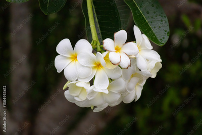 White Frangipani flower Plumeria alba with green leaves