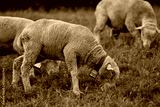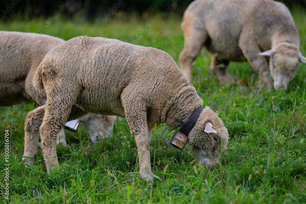 The sheep in the meadows. Sheep pasture on an farm, close up. Sheep eating grass on a field. Sheep grazing in an farm.