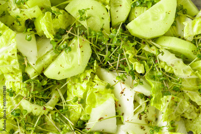 Fresh green salad with microgreens and vegetable mix. Healthy food and vegetarian lunch. Concept plant base diet for health lifestyle.