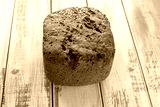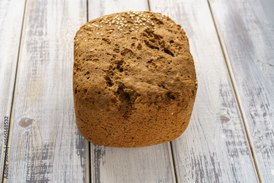 Whole grain bread loaf with sesame seeds and flax seeds on a rustic wooden table, healthy fresh baked snack food, homemade natural delicious bakery product concept.