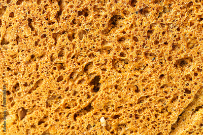 Close detailed macro view of wholesome whole grain bread texture showing the porous crust of rye country homemade bread, a baking sweet abstract background.