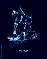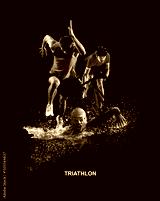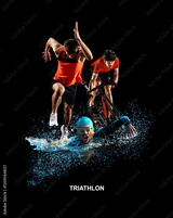 Conceptual collage. Three male triathletes in action, swimming, cycling and sprinting against black background with vibrant water splash and red suits. Concept of sport motivation, competition.