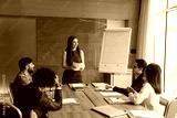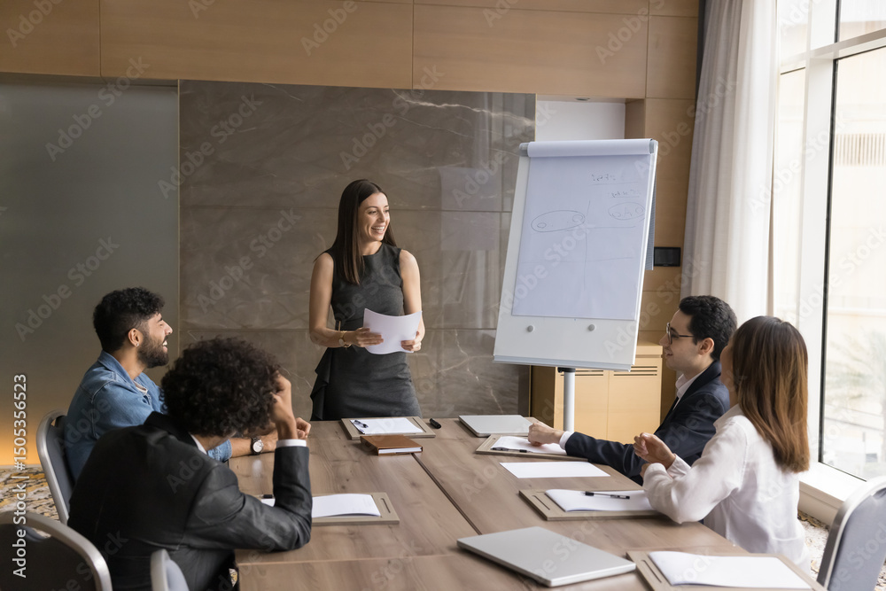 On the job training. Happy businesswoman mentor coach meeting multiracial business team at boardroom leading skill developing program event offer paper handout materials to diverse executives trainees