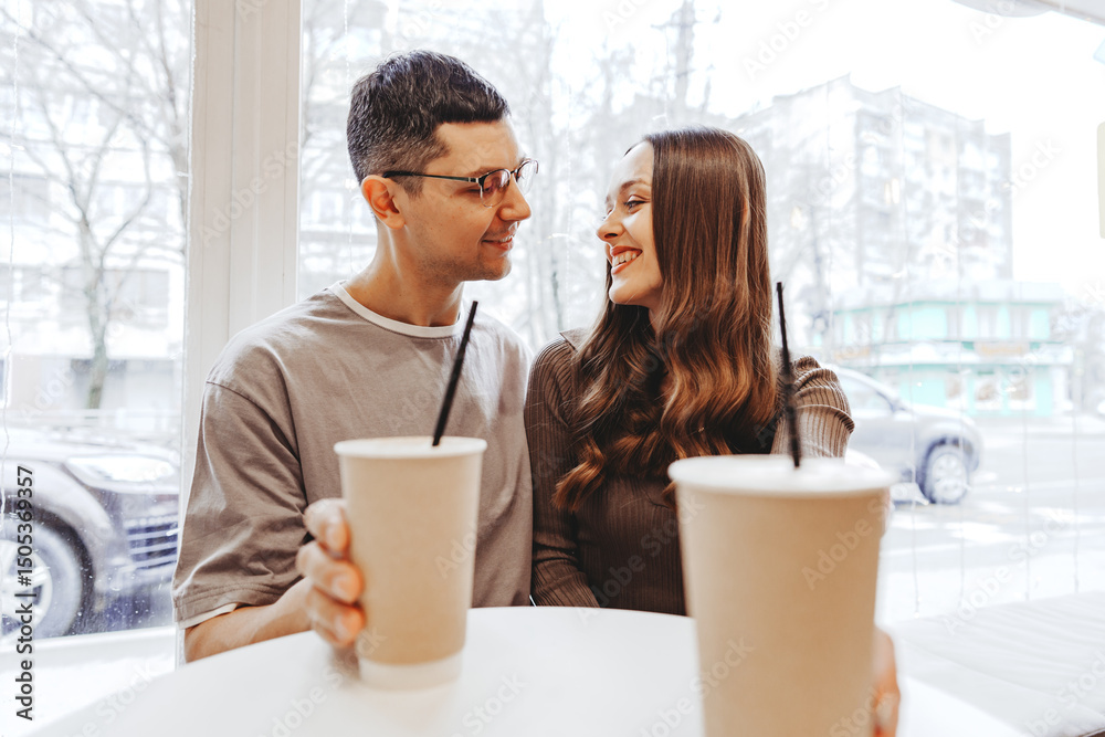 Young couple enjoying warm drinks together at a cozy cafe on a chilly day while smiling at each other