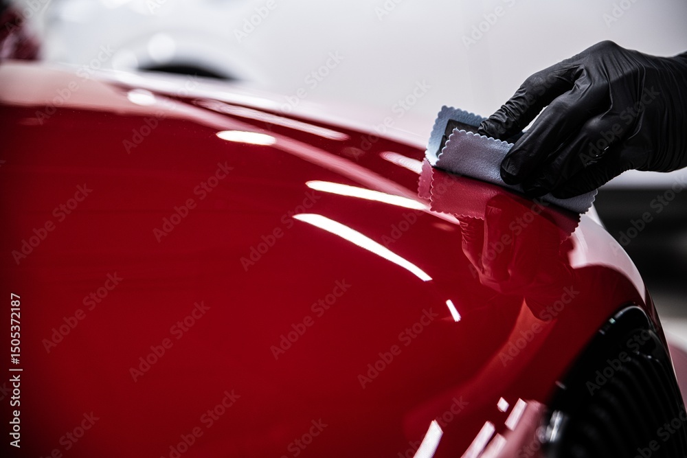 Detailer applying ceramic coating to a red car hood using an applicator pad.