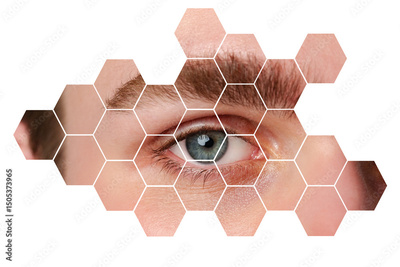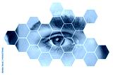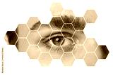 Eye close-up with hexagonal pattern overlay illustrating vision and perception in digital art