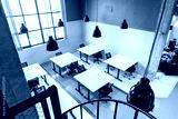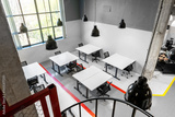 Modern coworking space with large windows and minimalist design in a busy urban setting