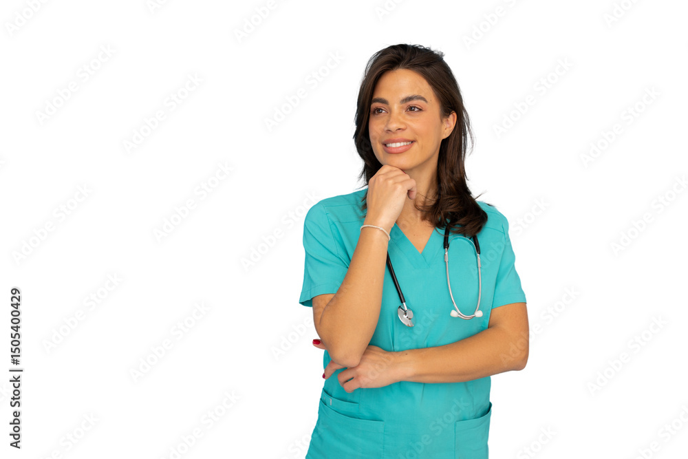 Healthcare worker in teal scrubs and stethoscope standing with pensive look, white background, professional medical setting