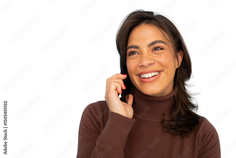 Smiling businesswoman making a phone call and looking away, isolated on transparent background