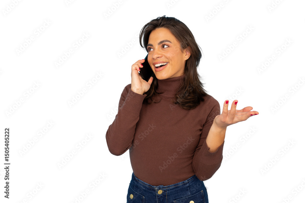 Young woman in turtleneck and jeans talking enthusiastically on smartphone, gesturing expressively against transparent background
