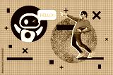 Zine pop image banner 3d photo collage of happy girl man stand artificial helper bot hello bubble communication future innovation