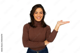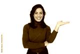 Studio portrait of a cheerful businesswoman showing and presenting with open hand palm up, isolated on transparent background