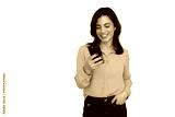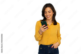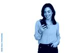 Professional woman smiling, texting on smartphone, representing contemporary workplace communication against clean white backdrop