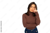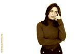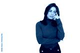 Young woman with long brown hair wearing turtleneck sweater and jeans, resting hand on chin, gazing pensively sideways against transparent background