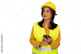 Professional female engineer checking smartphone while wearing safety vest and hard hat, standing at construction site with clean isolated background