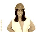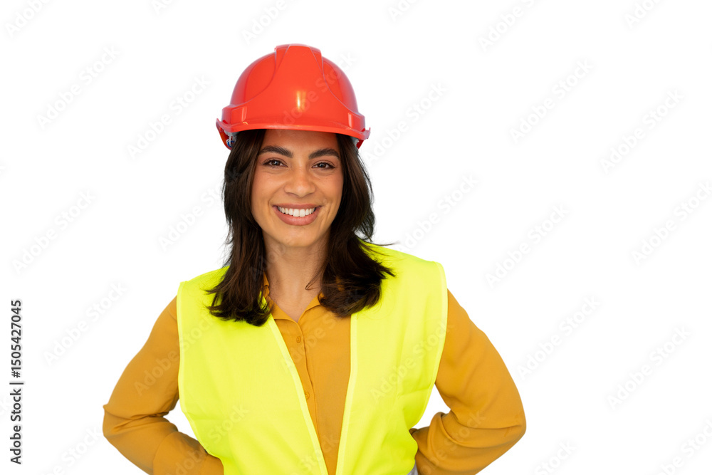 Portrait of a confident female engineer smiling, wearing a safety vest and helmet, on a transparent background, ready for work
