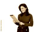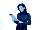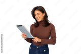 Smiling businesswoman scrolling digital tablet, reading webpage with transparent backdrop