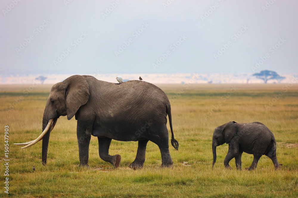Cría de elefante acompañado por un adulto, caminando por la sabana africana