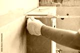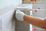 Laying tiles concept. Tiler, spatula and glue when laying tiles with close up hands. Measure correctly when repairing.