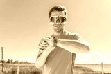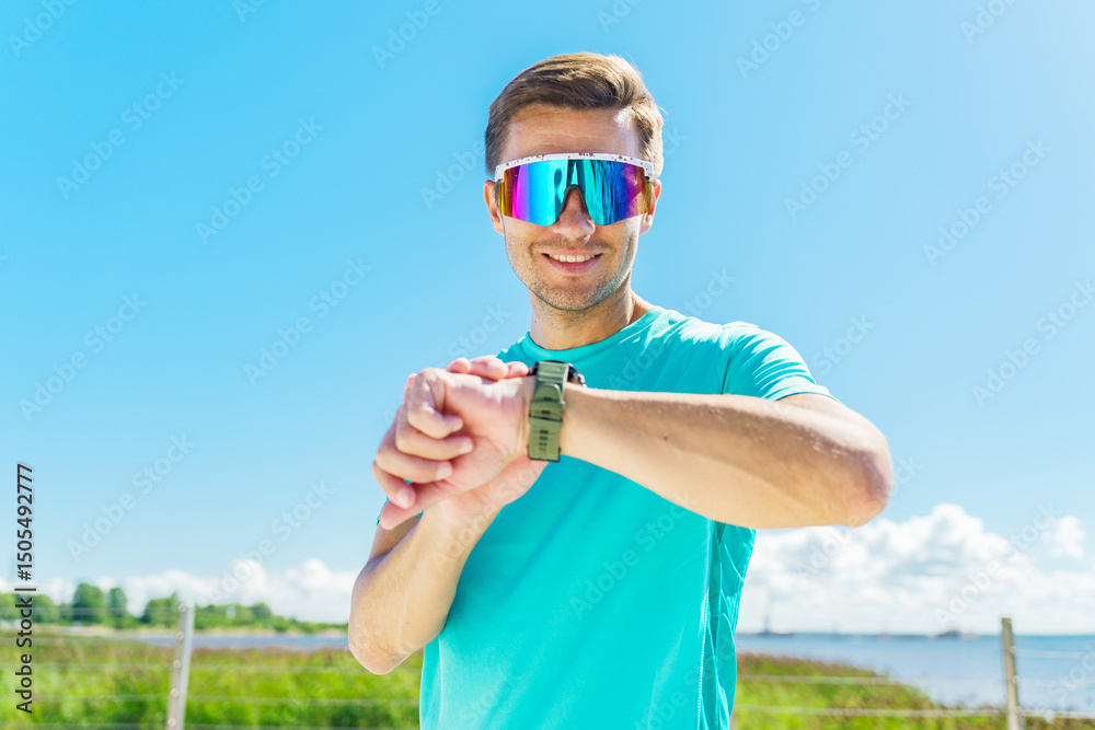 Bright and lively day by the water with an energetic man checking his watch while wearing colorful sunglasses
