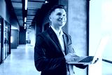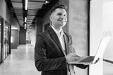 Professional man working in a modern office hallway, focusing on his laptop during business hours