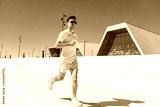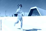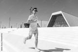 Dynamic runner enjoying a sunny day at a modern architectural site surrounded by vibrant colors