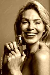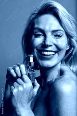 Beauty portrait of beautiful mature woman, concepts about cosmetics, skincare and wellness. Smiling mature woman holding essential oil serum for skincare routine