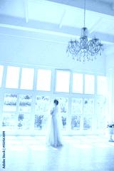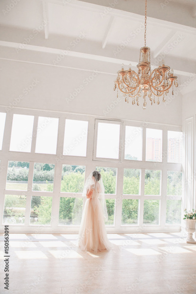 portrait of beautiful bride indoor. Fashion bride girl in gorgeous wedding dress in studio