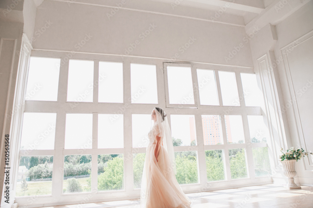 portrait of beautiful bride indoor. Fashion bride girl in gorgeous wedding dress in studio