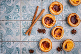 Traditional Portuguese custard tarts or Pastel de Nata freshly baked cream dessert on tile background. Top view, flat lay. High quality photo
