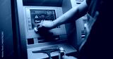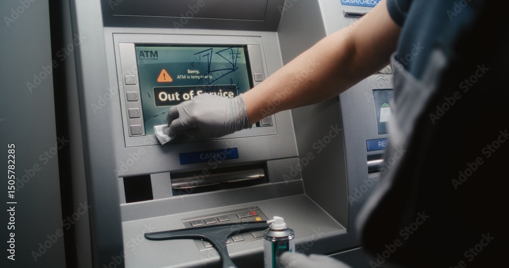 Cleaner Wiping Vandalized ATM Screen with Rag, Removing Graffiti, Scribbled Tags from Automated Teller Machine, Cash Machine. Cleaning Service, Property Damage, Vandalism of Public Banking Equipment.