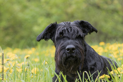 Portrait of the Giant Black Schnauzer Dog lying at the blossoming dandelion meadow