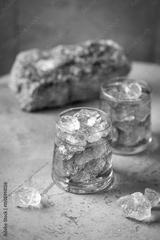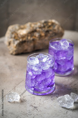 Blueberry purple drink with ice in a glass on gray stone background. A summer refreshing drink.