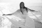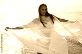 Beautiful Woman in White translucent Chiffon Dress flowing on Wind on the Beach at Sunset Sunshine. Carefree Girl enjoying Sun at Seaside. Summer Vacation and Holidays. Freedom and Relaxation