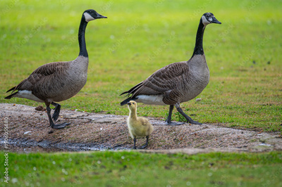 Canada geese at a pond with their chicks