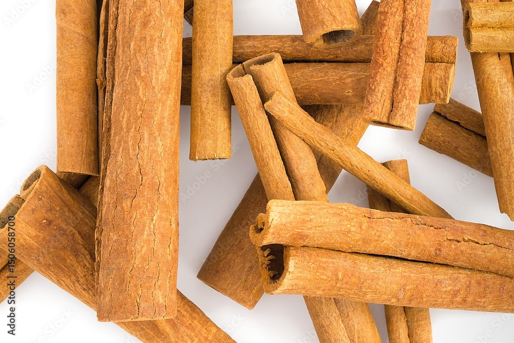 Various cinnamon bark pieces arranged on a white background, focusing on their unique forms and textures.