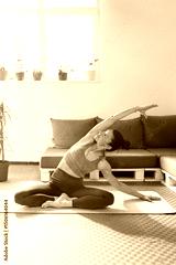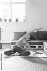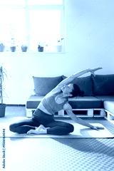 Woman practicing yoga in a bright living room with plants and a comfortable sofa