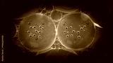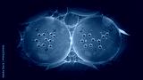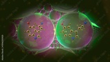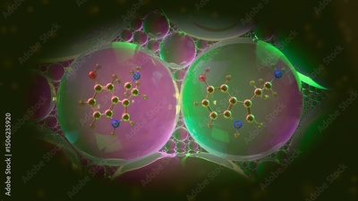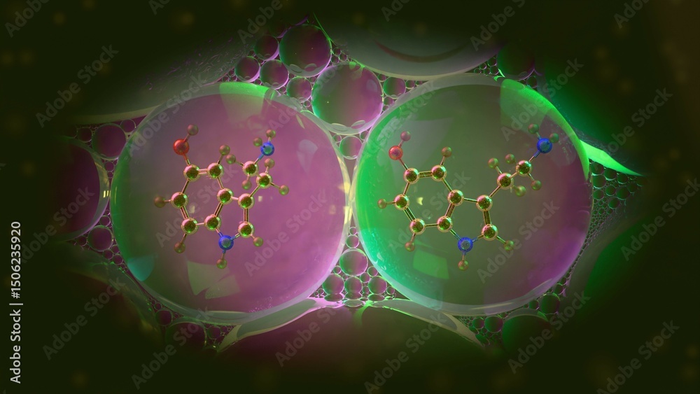 3D render of organic molecule suspended inside colorful translucent bubbles, symbolizing chemical structure, neurochemistry, and psychedelic scientific visualization on a vertical abstract background